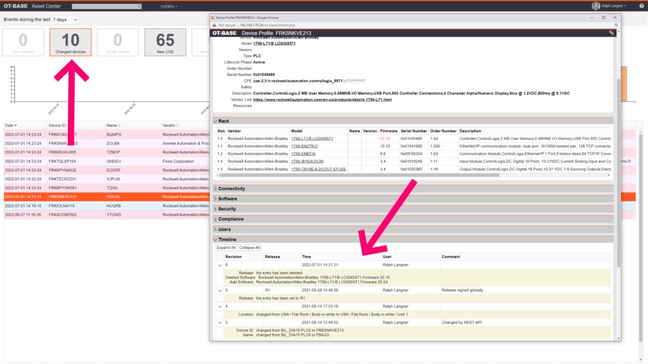 OTbase automatically maintains a configuration timeline for each device where you can check all configuration changes. In this examle we see that the firmware of a PLC was updated.
